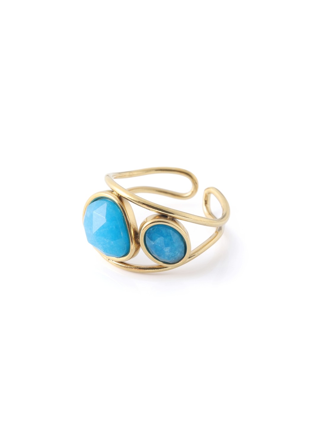 Anillo dorado con diseño de doble aro entrelazado, decorado con piedras de jade. Su forma envolvente y colores contrastantes reflejan equilibrio y elegancia natural.