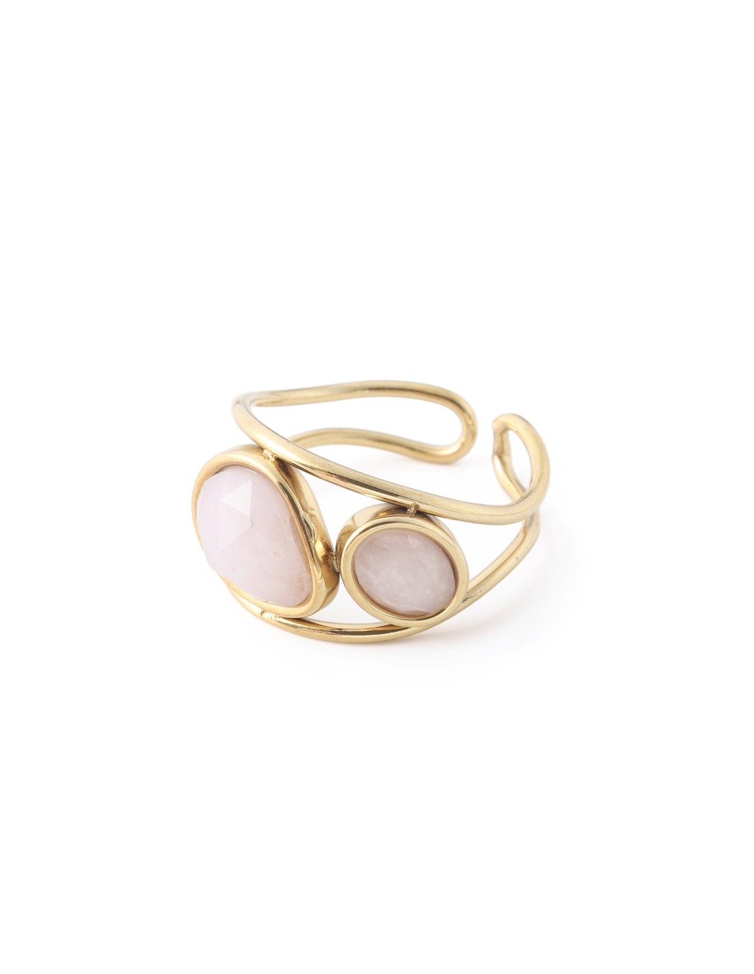 Anillo dorado con diseño de doble aro entrelazado, decorado con piedras de jade. Su forma envolvente y colores contrastantes reflejan equilibrio y elegancia natural.