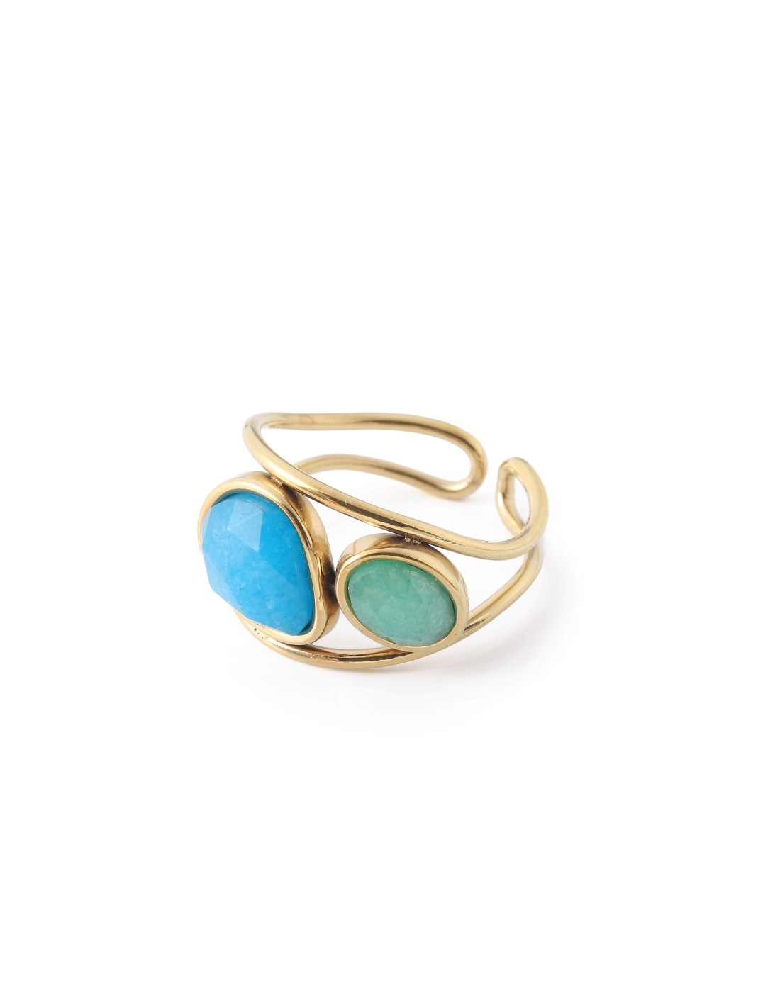 Anillo dorado con diseño de doble aro entrelazado, decorado con piedras de jade. Su forma envolvente y colores contrastantes reflejan equilibrio y elegancia natural.