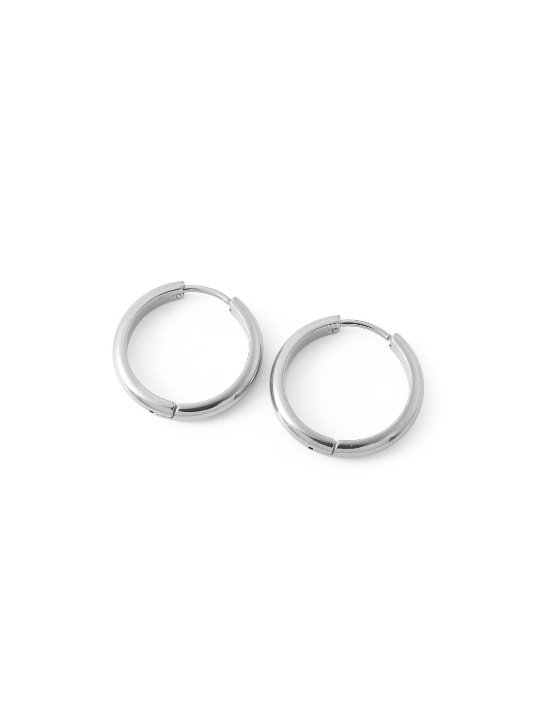 Pendientes de aro plateados de acero inoxidable con acabado pulido brillante. Su diseño simple y moderno los hace ideales para el uso diario o combinar con cualquier estilo. Resistentes, ligeros y cómodos de llevar.