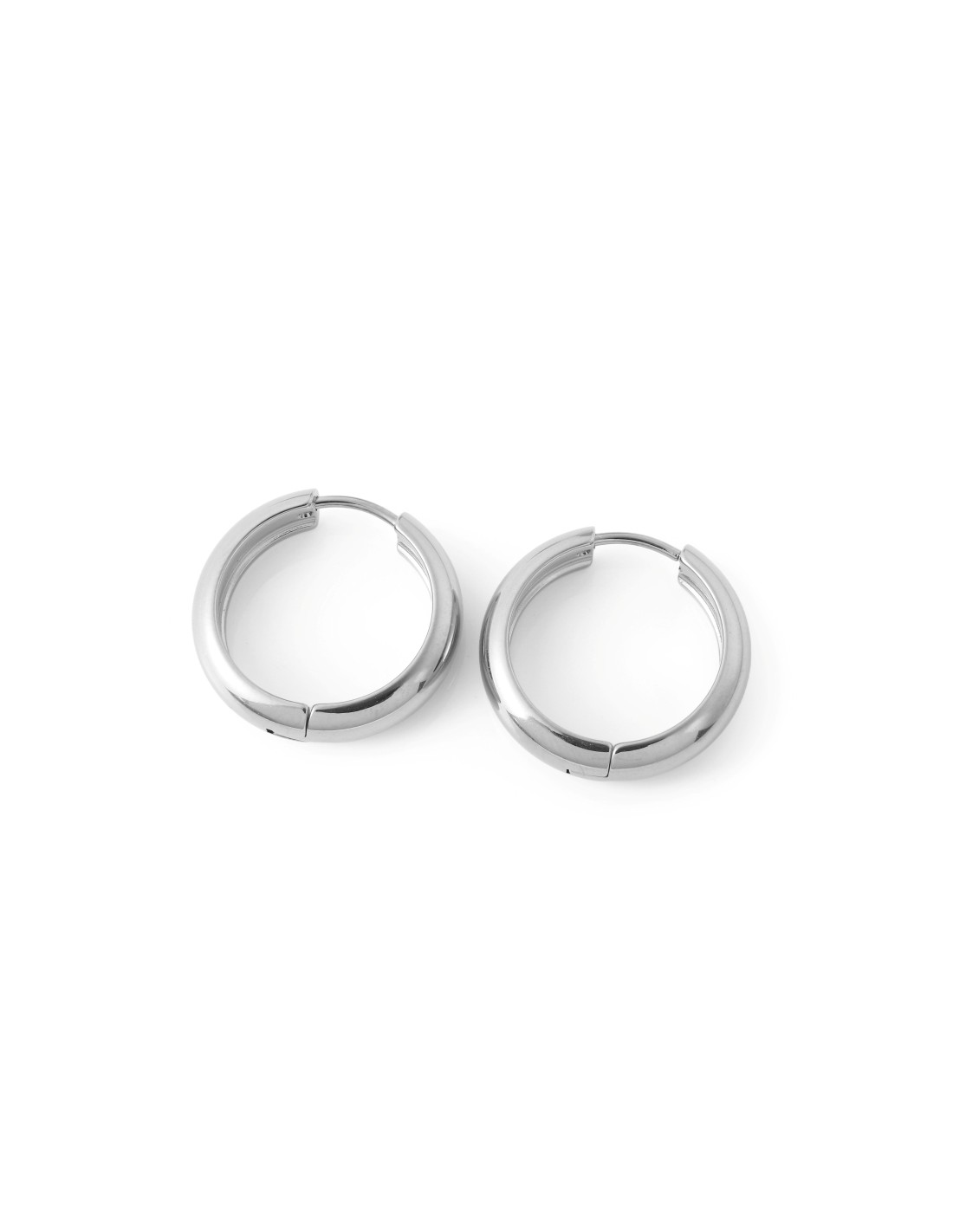 Pendientes de aro plateados gruesos con acabado pulido. Su diseño redondeado aporta un estilo contemporáneo y refinado. Fabricados en acero inoxidable, son resistentes, cómodos y perfectos para cualquier ocasión.