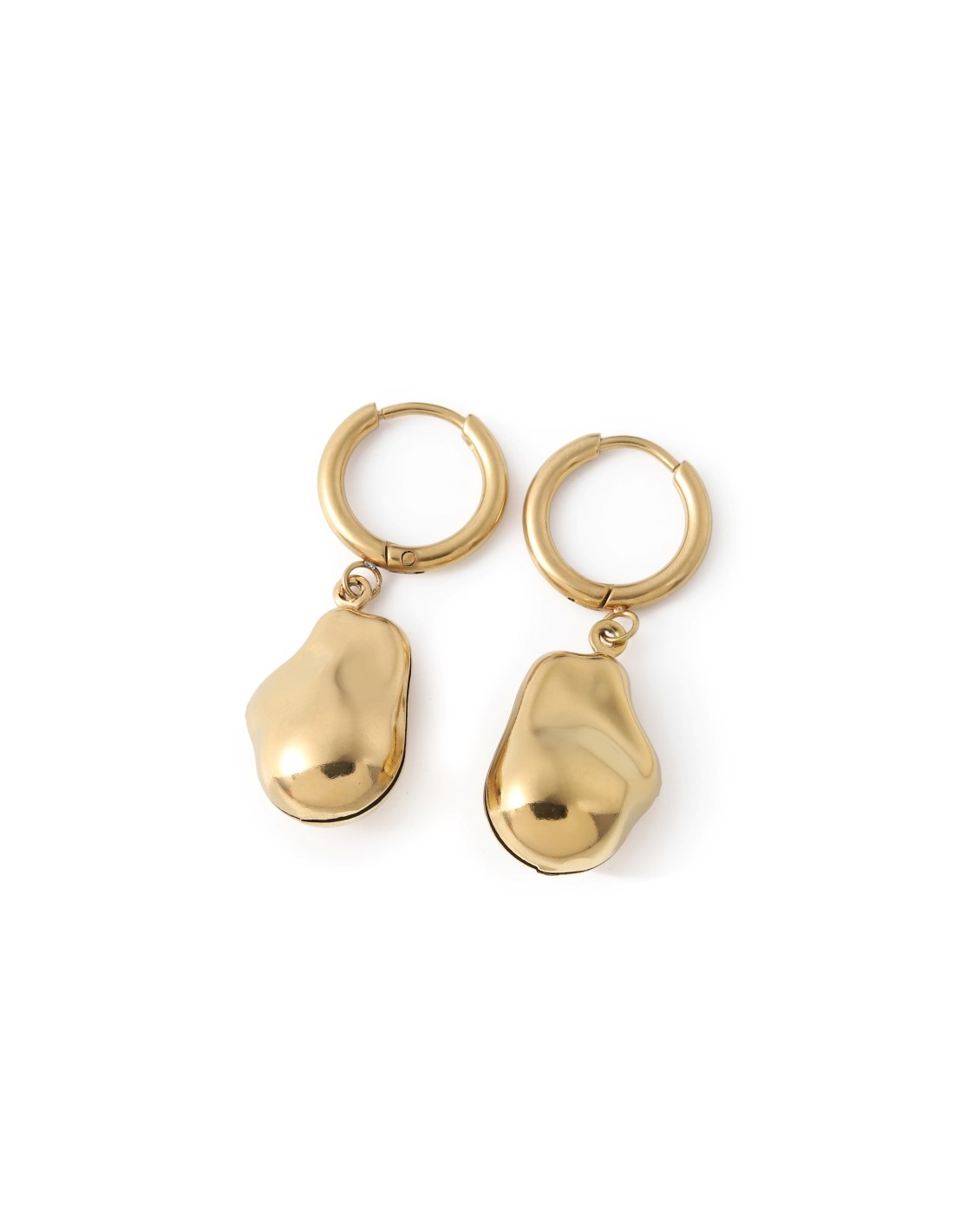 Estos pendientes presentan colgantes en forma de gotas metálicas con un acabado fluido y escultórico, creando un efecto moderno y distintivo. Su aro combina simplicidad y estilo, perfectos para quienes buscan un accesorio llamativo pero elegante.