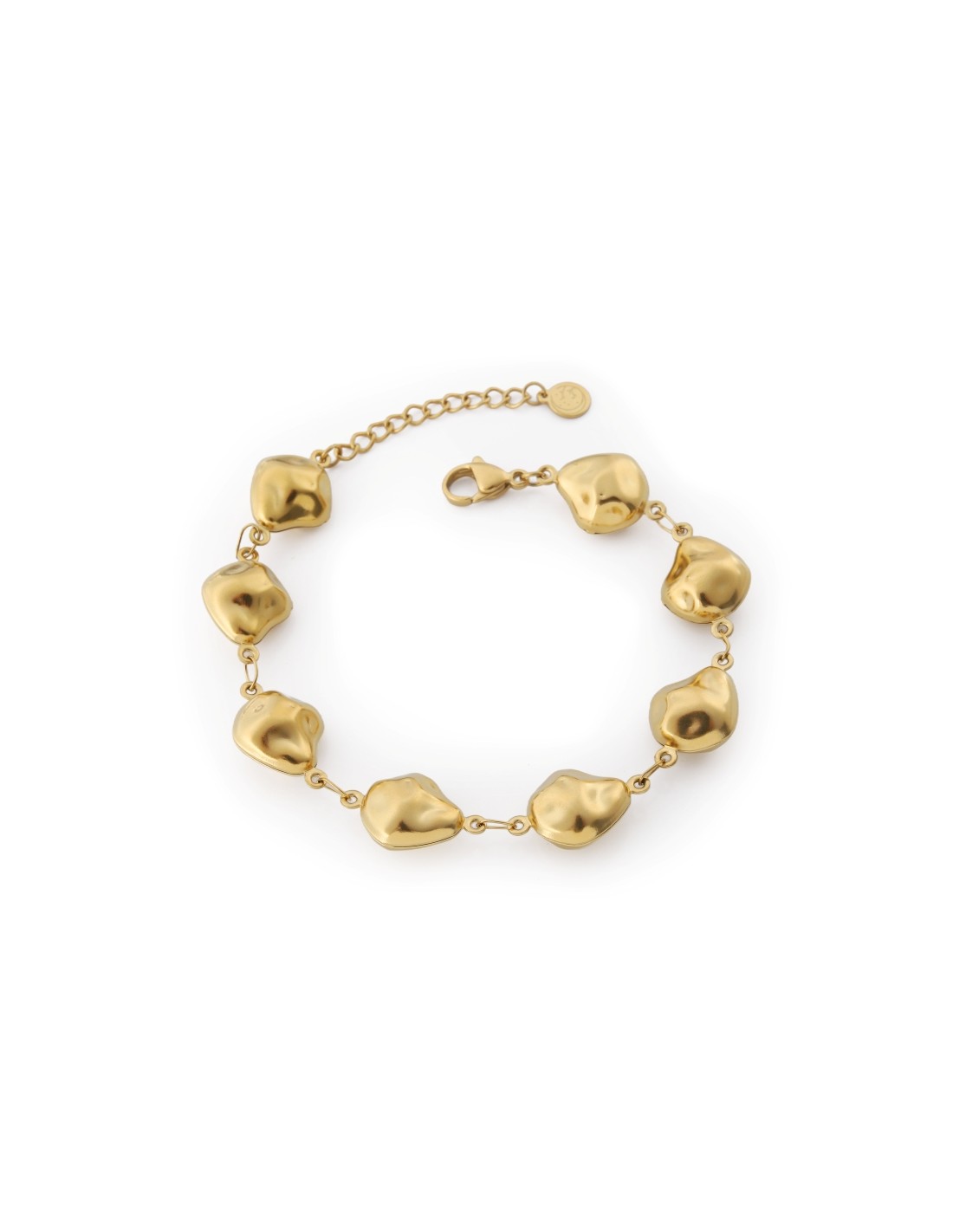 Pulsera dorada compuesta por eslabones irregulares de estilo orgánico, con un brillo suave y moderno. Su diseño único aporta textura y personalidad, perfecta para combinar con looks minimalistas o añadir un toque artístico al día a día.