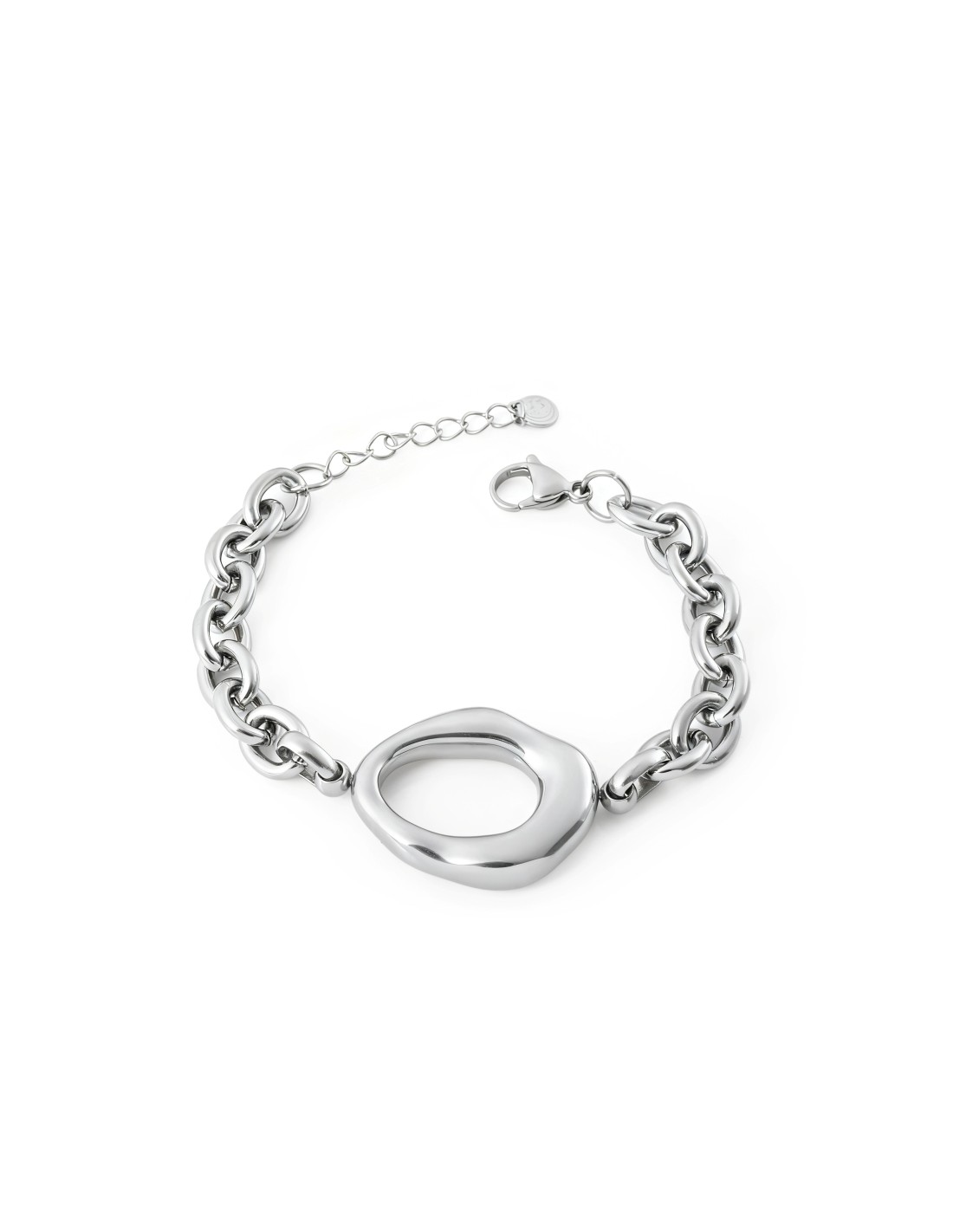 Pulsera plateada con un aro irregular como detalle central. Un accesorio minimalista pero llamativo para el uso diario.