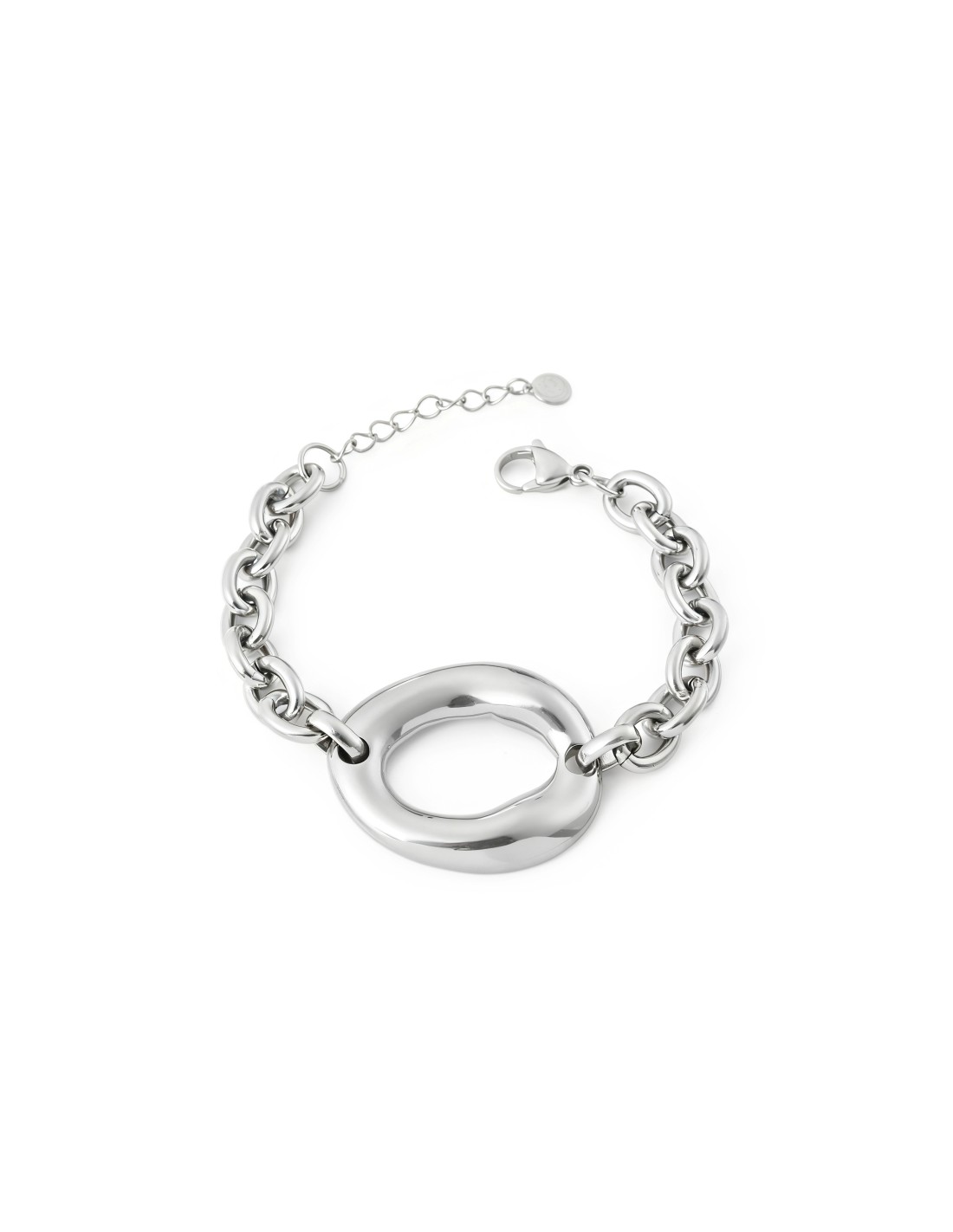 Pulsera de cadena plateada con un centro ovalado de diseño orgánico y pulido. Un accesorio moderno que añade un toque elegante a cualquier look.