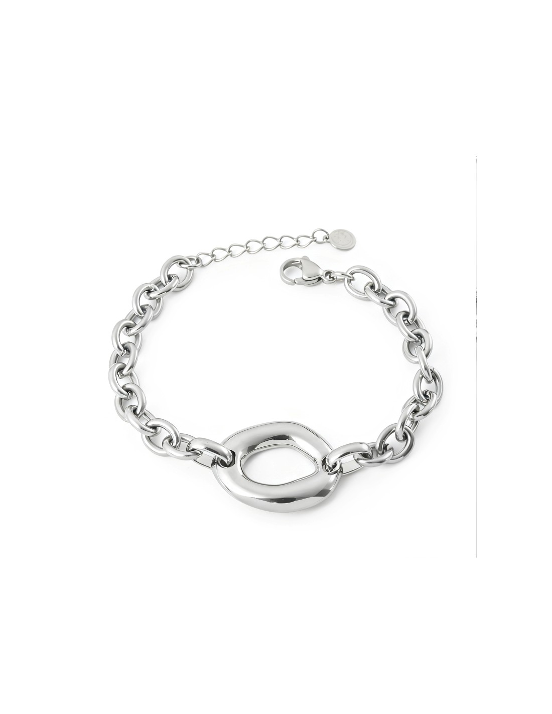 Pulsera elegante en color plateado, diseñada con un eslabón central de forma irregular y acabado pulido. Un accesorio moderno que destaca por su estilo minimalista y contemporáneo.
