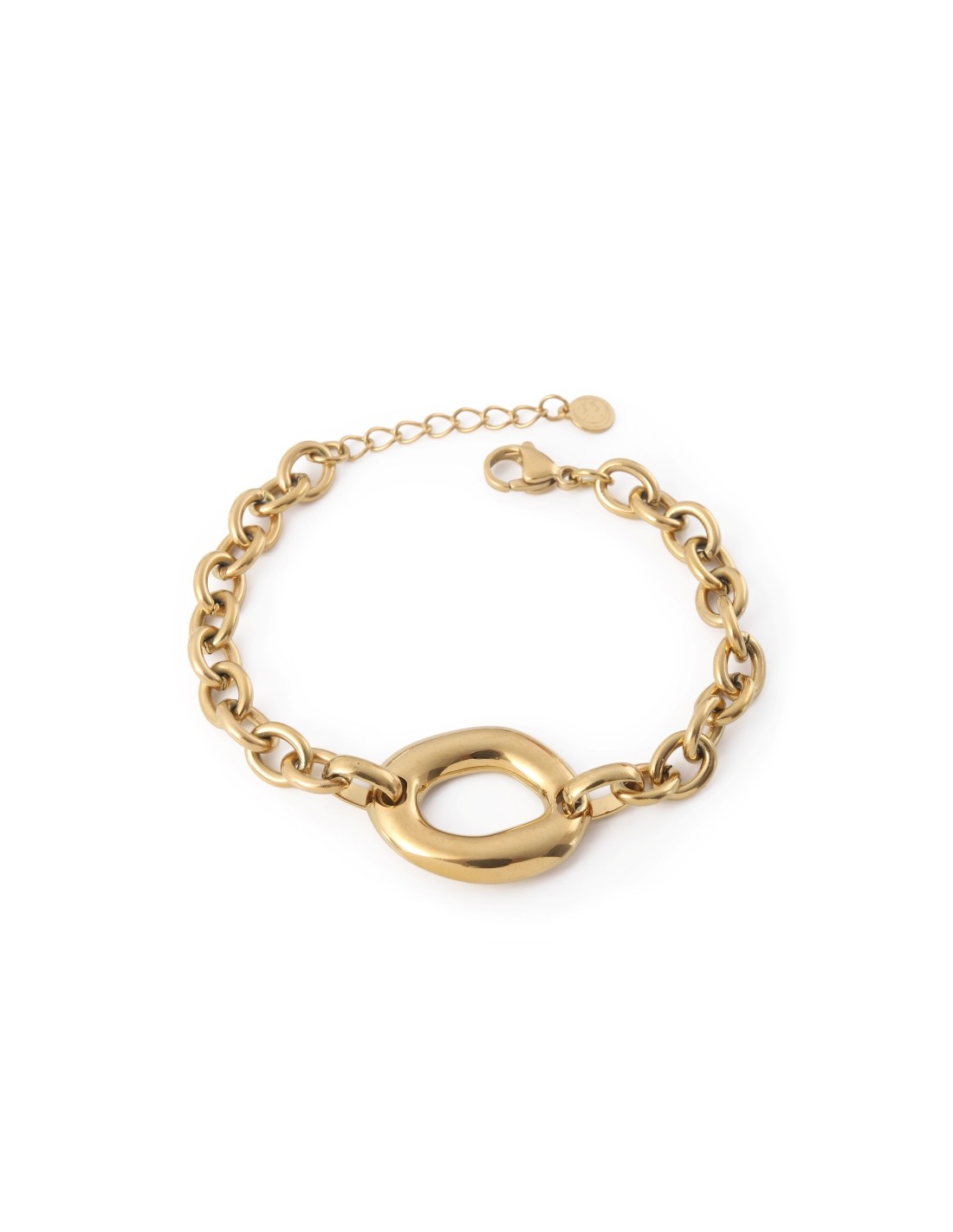 Pulsera elegante en color dorado, diseñada con un eslabón central de forma irregular y acabado pulido. Un accesorio moderno que destaca por su estilo minimalista y contemporáneo.