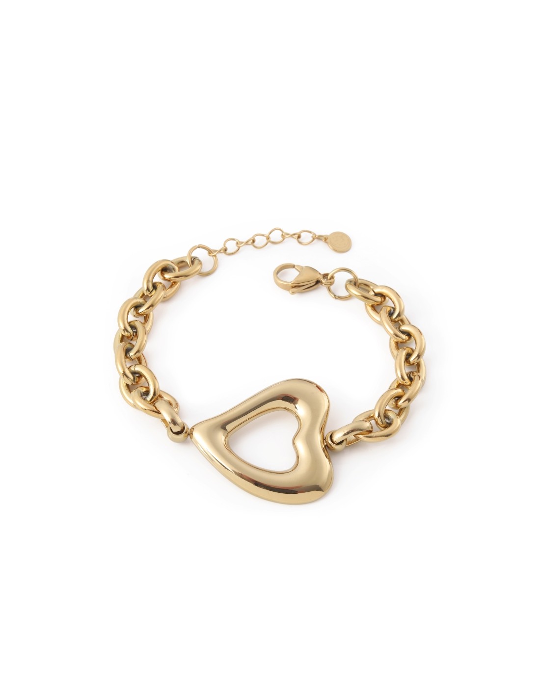 Pulsera de eslabones dorados con un dije central de corazón hueco y acabado brillante. Un diseño moderno y romántico para usar a diario.