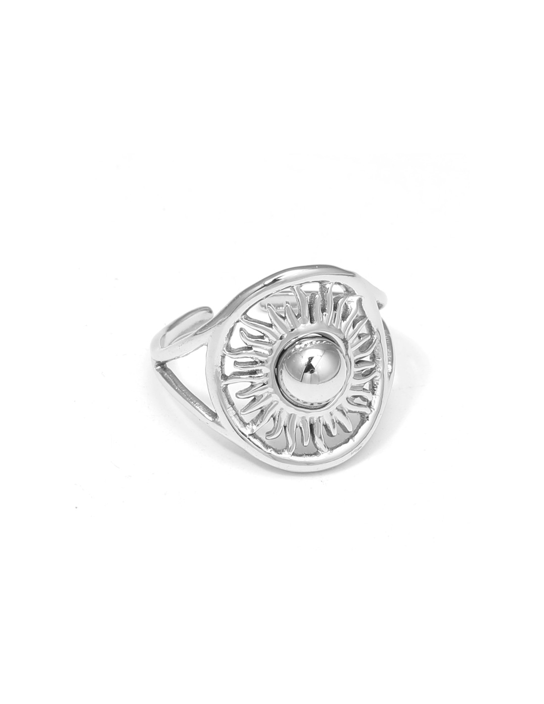 Anillo plateado con un llamativo diseño de sol calado y centro abombado. El diseño abierto y ajustable ofrece comodidad. Es una pieza de tendencia, ideal para el uso diario.