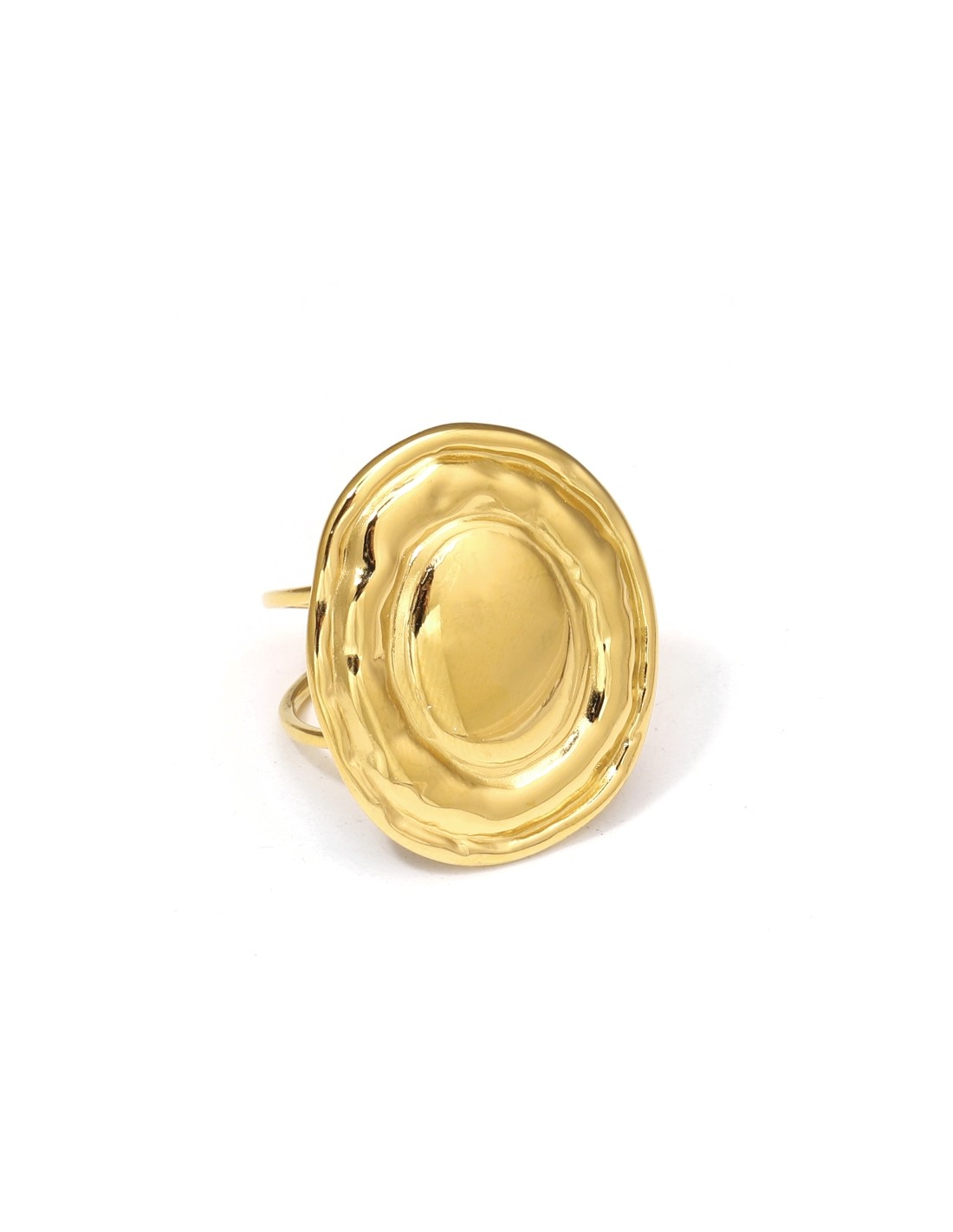 Anillo dorado con un acabado pulido y efecto de ondas fluidas. Diseño moderno y escultural, ideal para un look llamativo y el uso diario.