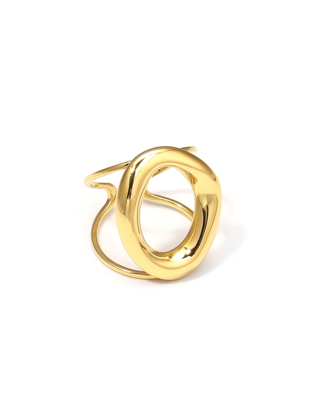 Anillo dorado con una banda fina que sostiene un gran óvalo hueco. Diseño de estilo minimalista y vanguardista. Es un accesorio ligero, elegante y fácil de combinar, ideal para el uso diario.