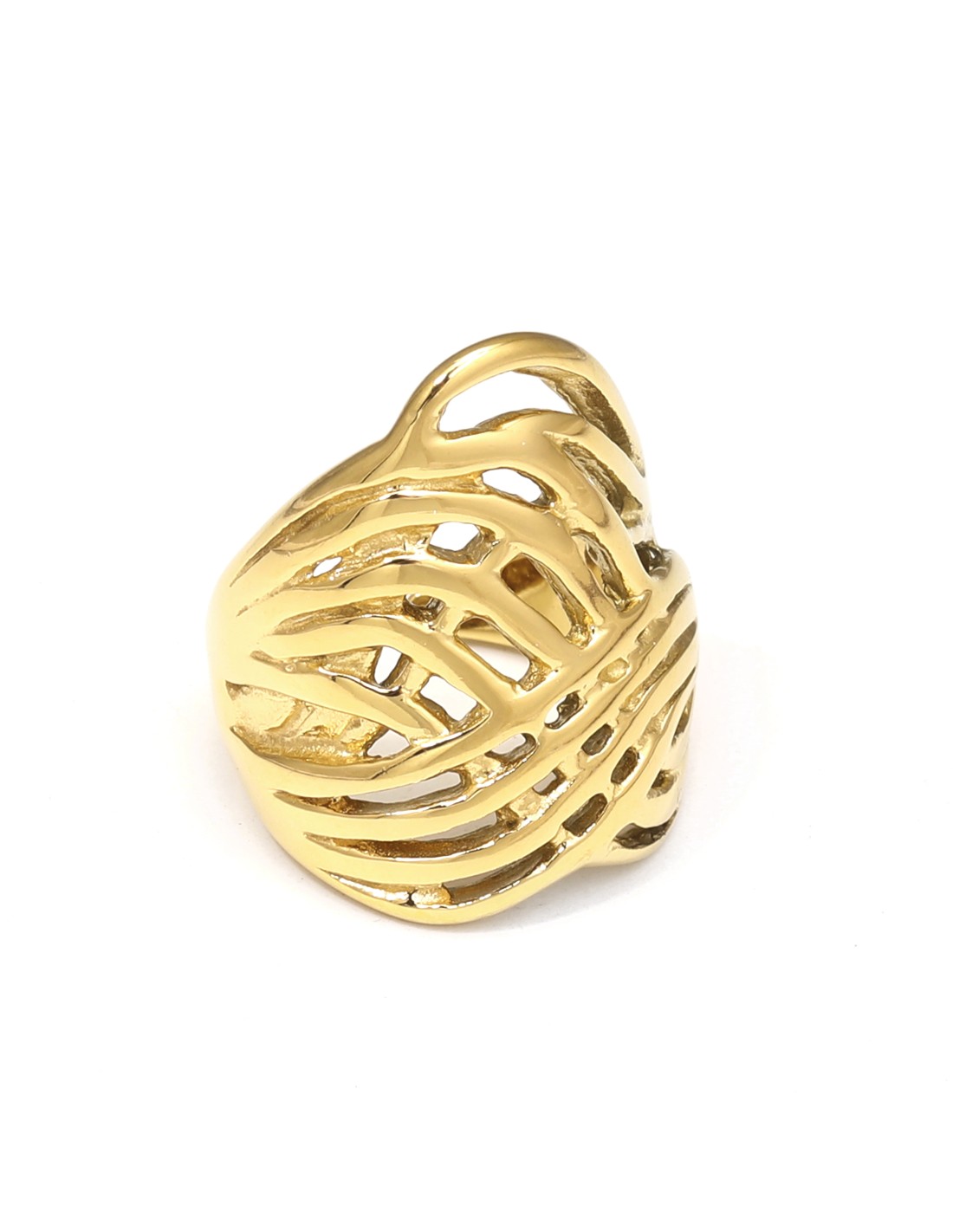 Anillo dorado ancho con un diseño intrincado de patrón de rejilla. Una pieza de declaración moderna y llamativa.