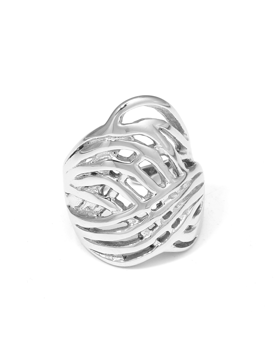 Anillo ancho con un diseño intrincado de patrón de rejilla y acabado plateado pulido. Una pieza de declaración moderna y llamativa.