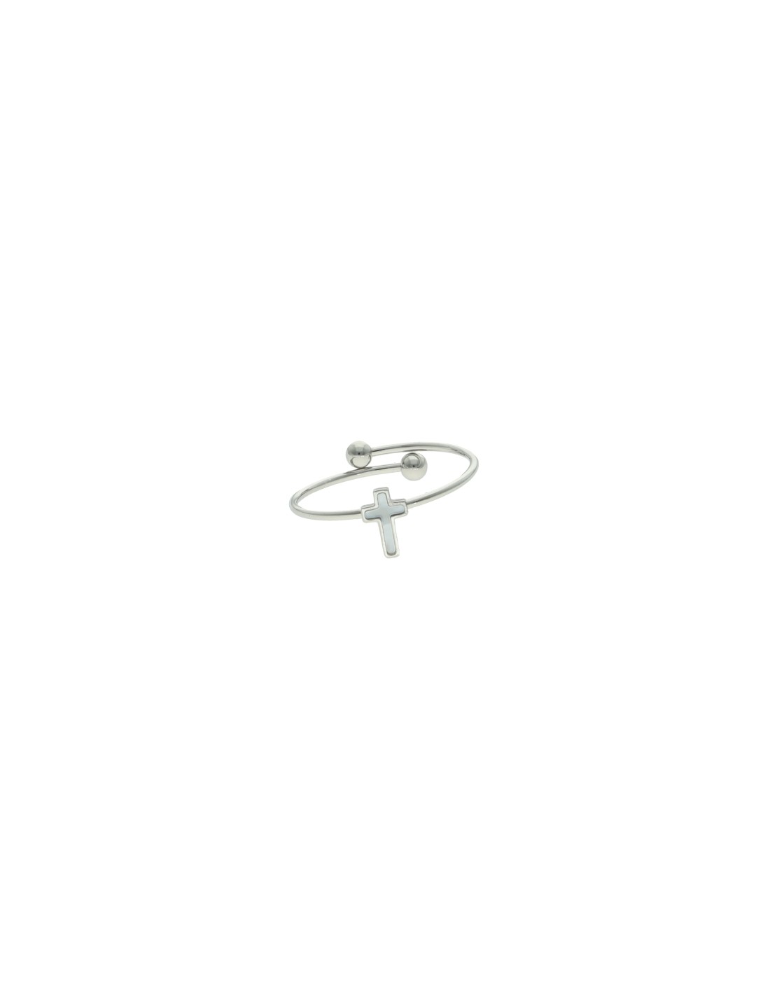 Anillo minimalista con un delicado detalle de cruz de nácar, elegante y versátil.