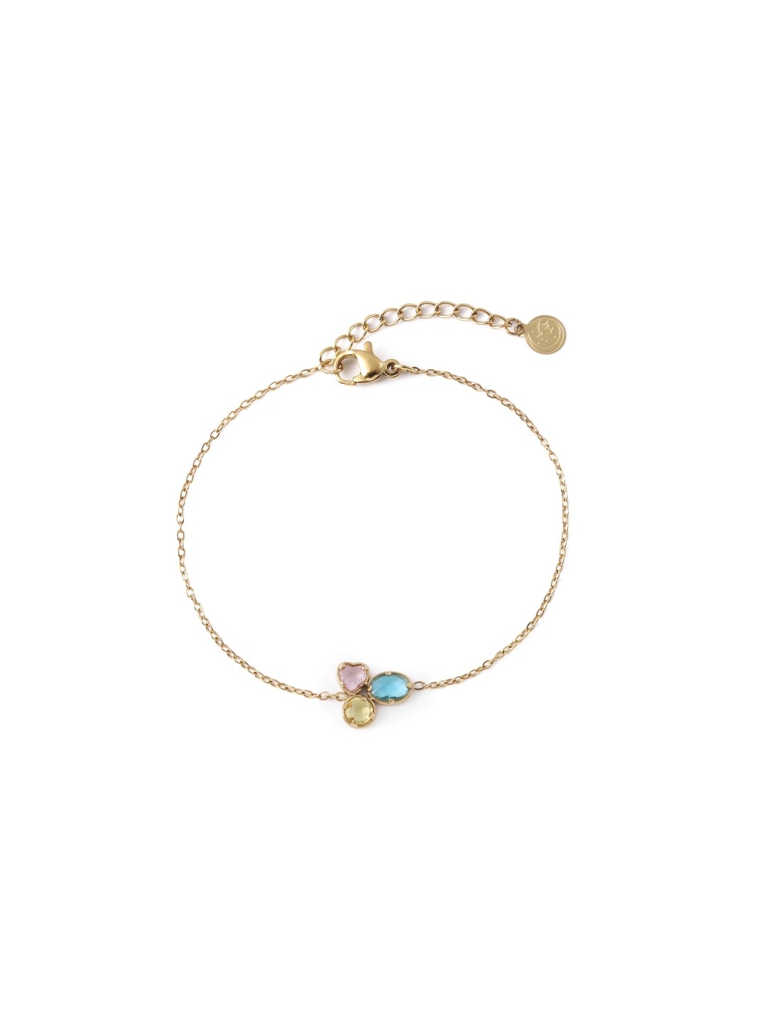 Pulsera dorado delicada con cristales de colores que aporta un brillo suave y elegante.