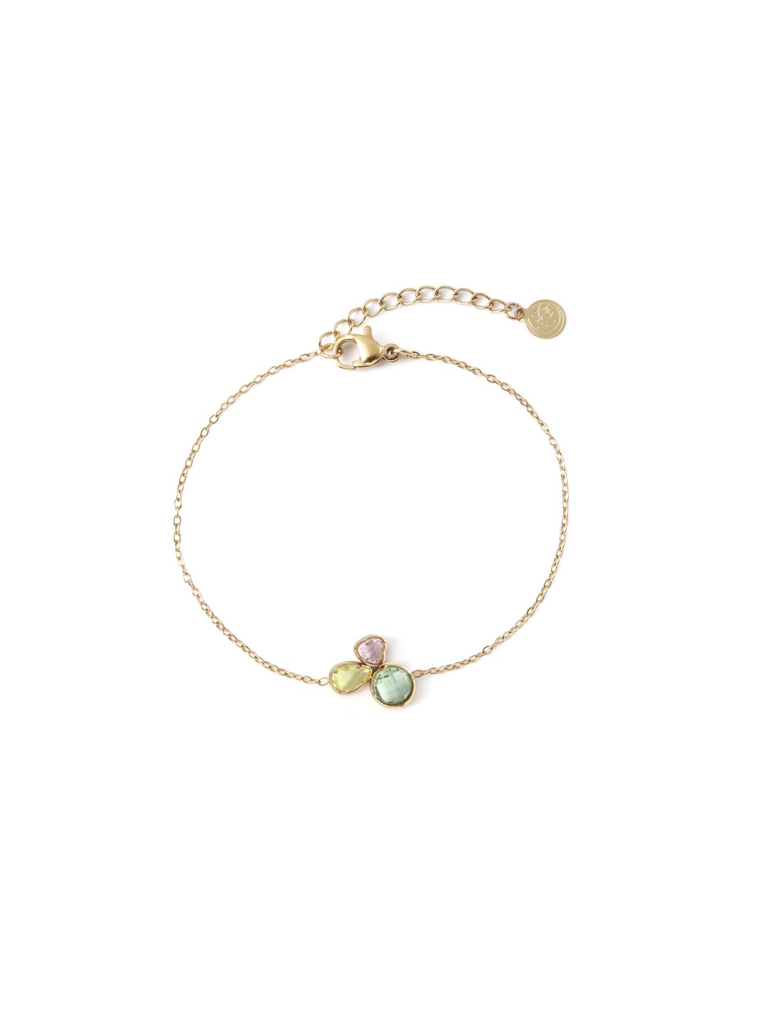 Pulsera dorado delicada con cristales de colores que aporta un brillo suave y elegante.