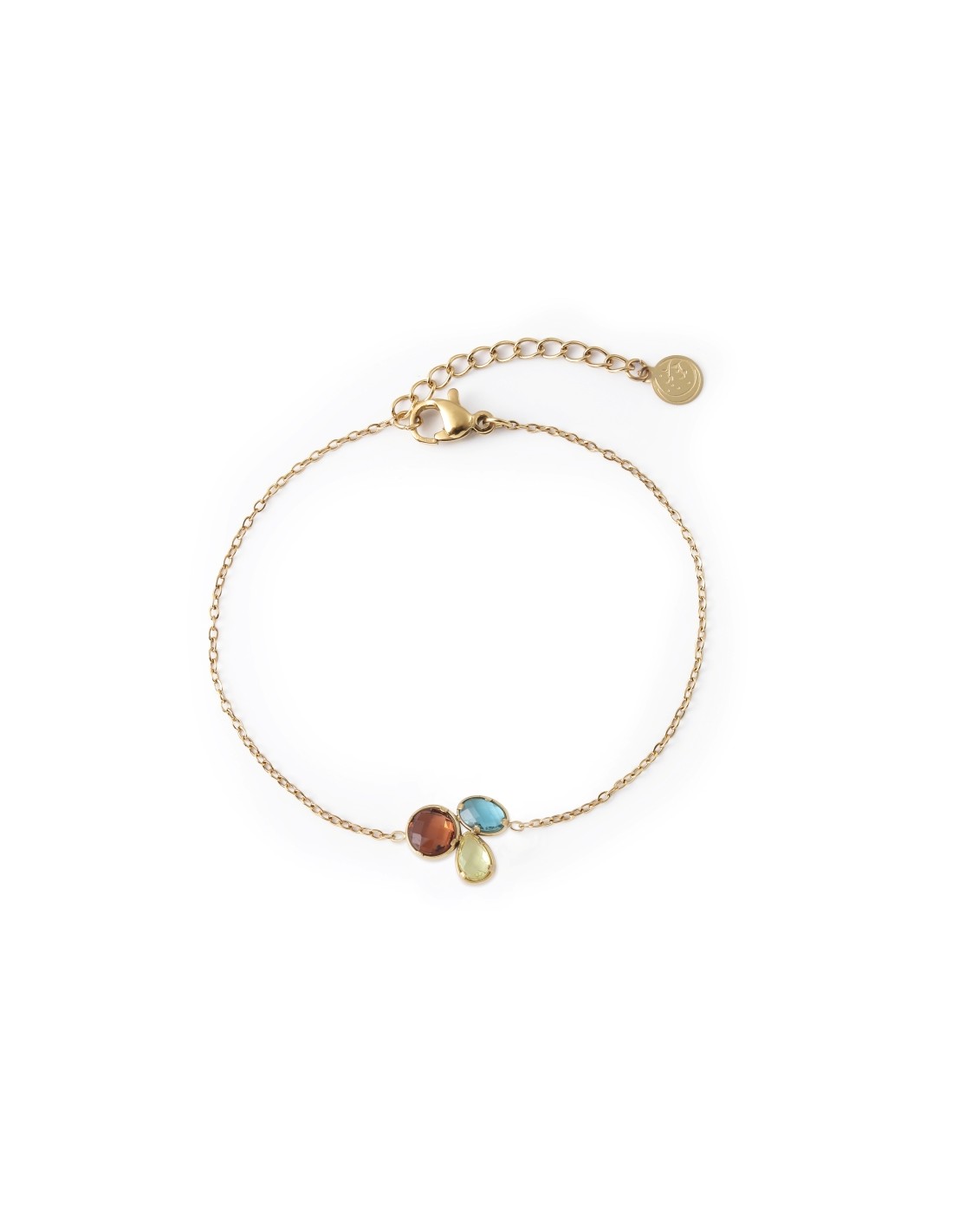 Pulsera dorado delicada con cristales de colores que aporta un brillo suave y elegante.
