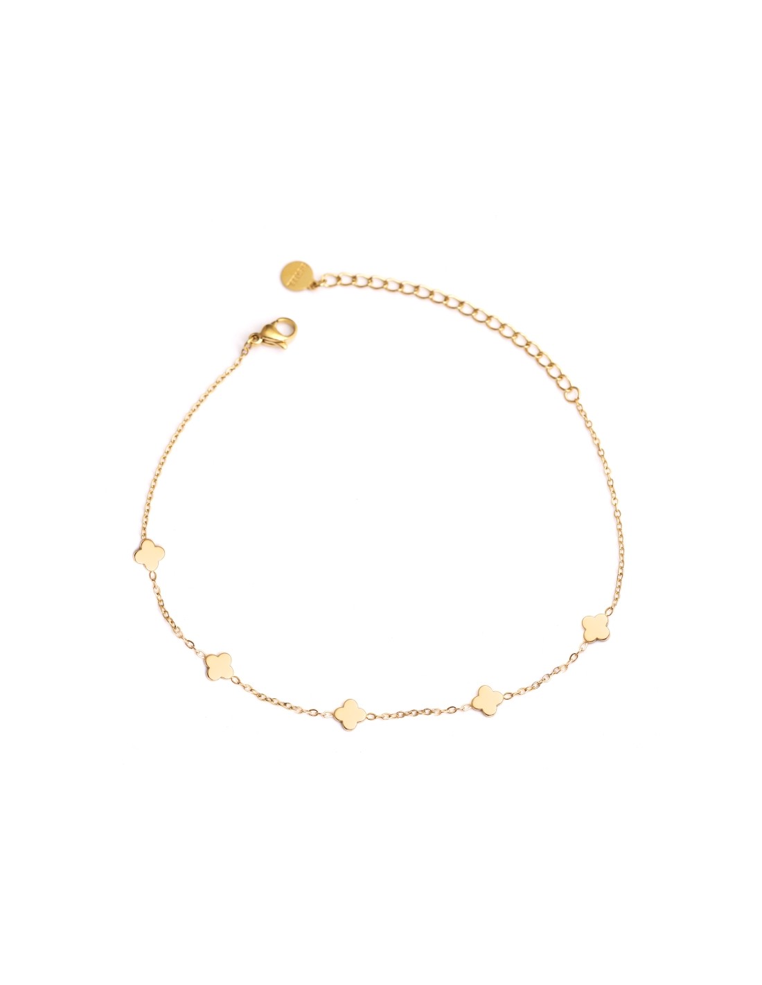 Tobillera fina con pequeños colgantes de trébol de cuatro hojas, delicada y elegante.