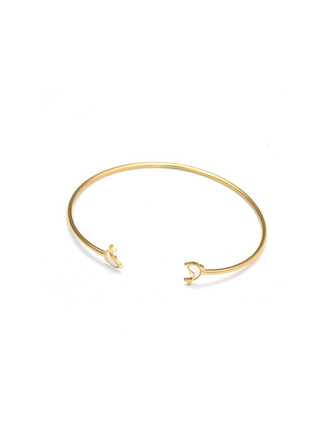 Pulsera rígida dorada con delfín elaborado en nácar blanco, diseño elegante.