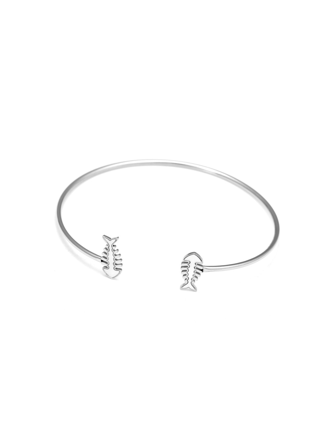 Pulsera rígida plateada con pez elaborado en nácar blanco, ligero y elegante.