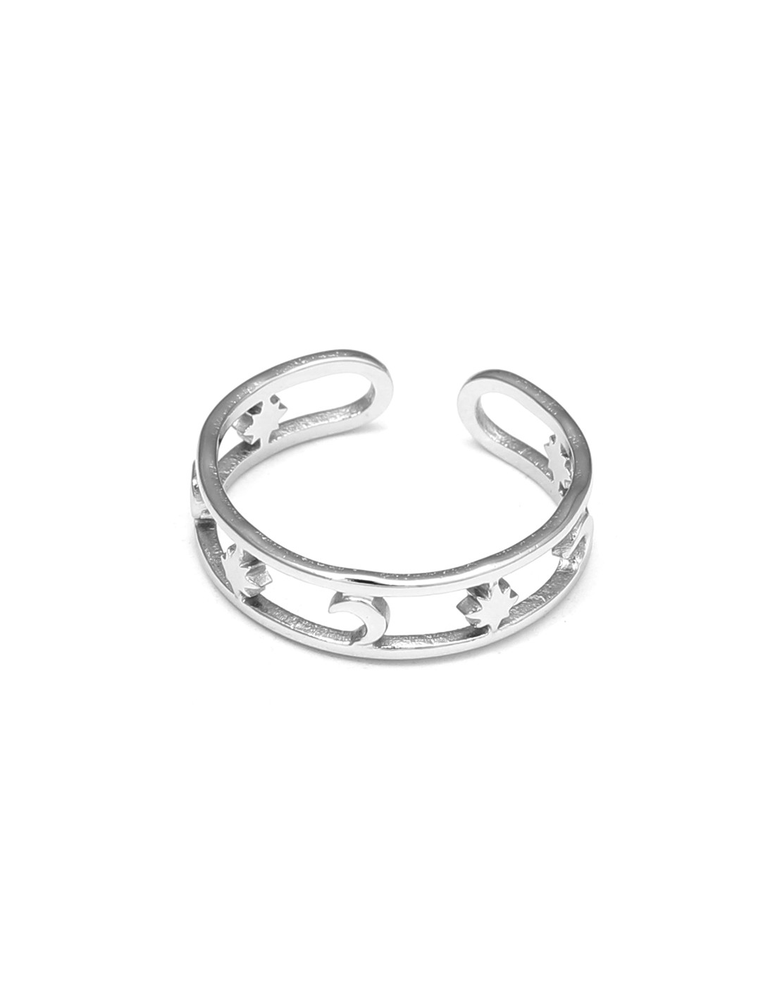 Anillo plateado con diseño calado de estrella y luna. Un accesorio elegante que combina fuerza y feminidad.