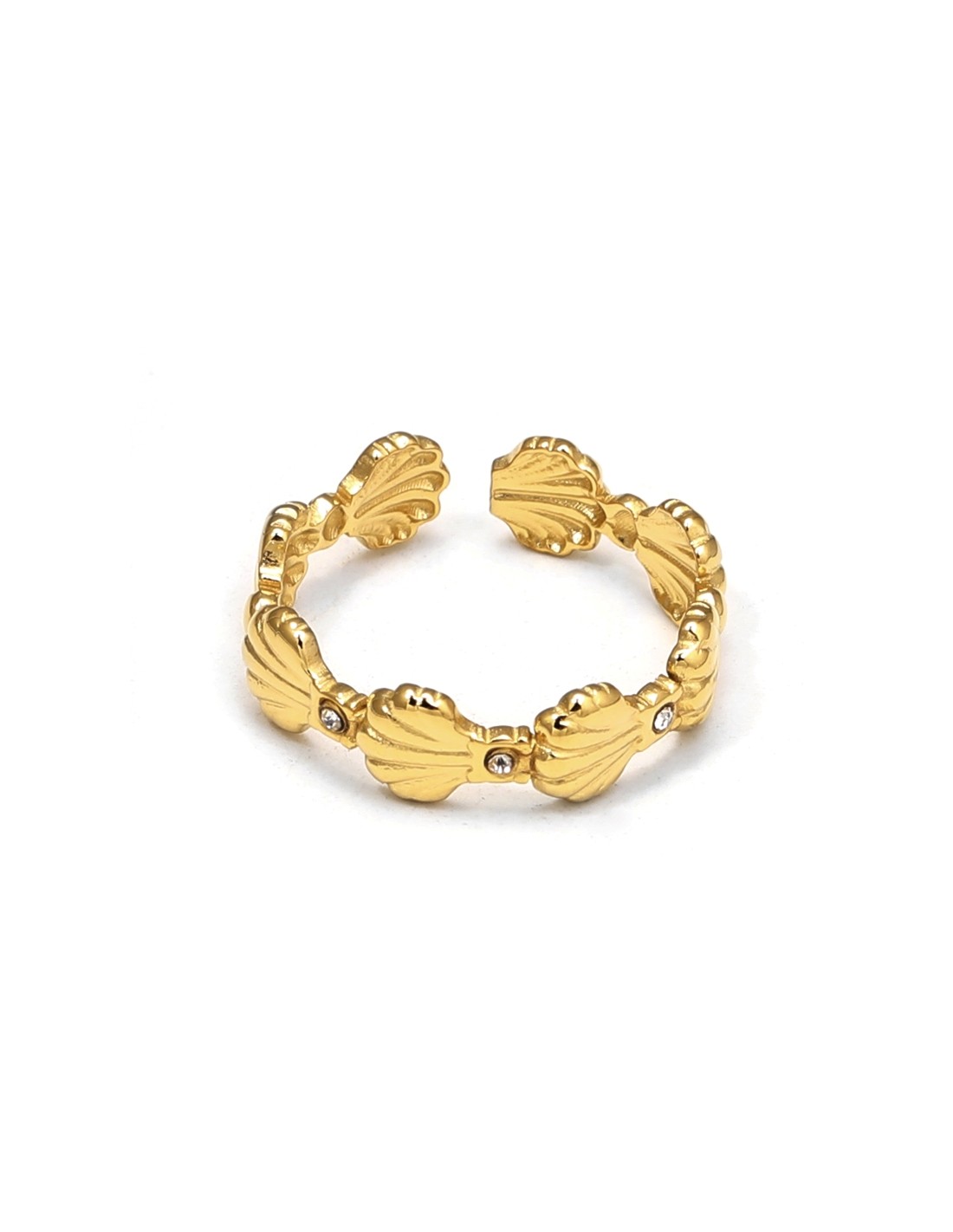 Elegante anillo con diseño de conchas y pequeños cristales brillantes, ajustable y llamativo.