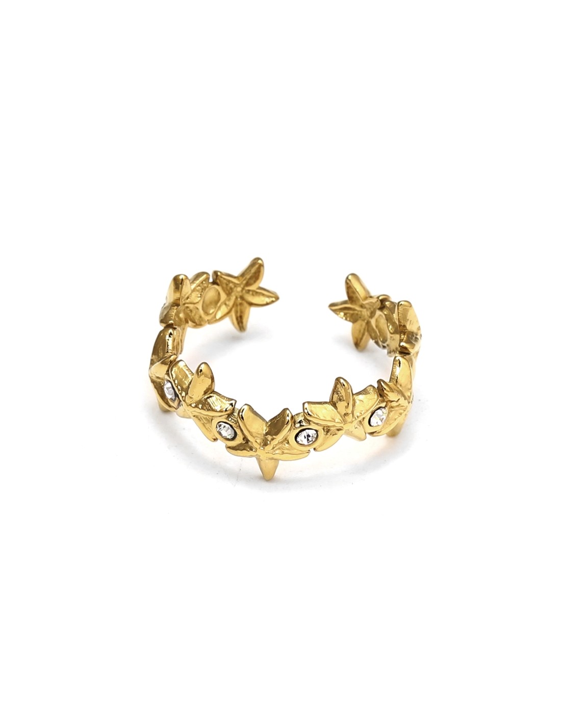 Elegante anillo con diseño de estrellas y pequeños cristales brillantes, ajustable y llamativo.
