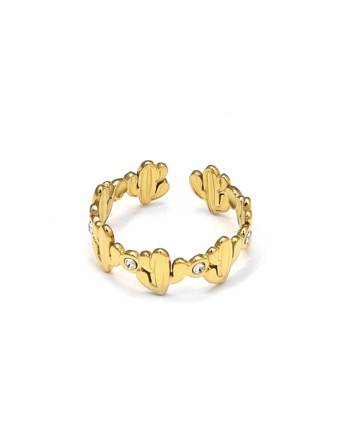 Elegante anillo con diseño de cactus y pequeños cristales brillantes, ajustable y llamativo.