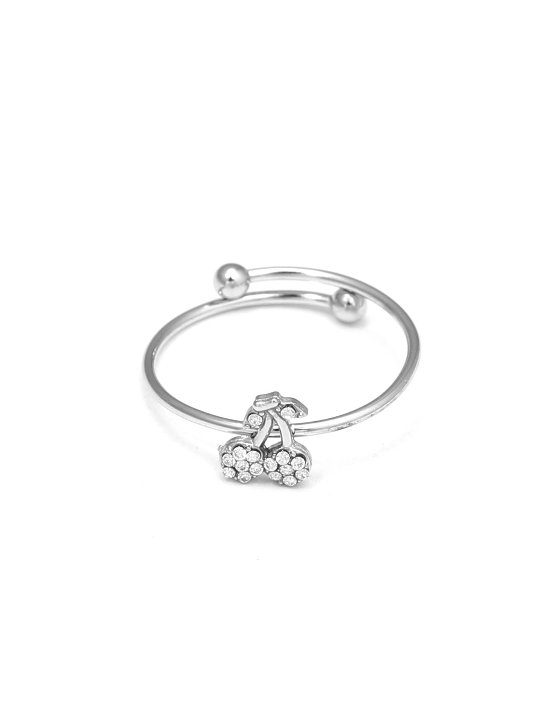 Anillo plateado en forma de media cerezas adornado con brillantes circonitas. Su diseño minimalista y cómodo la convierte en una pieza versátil.