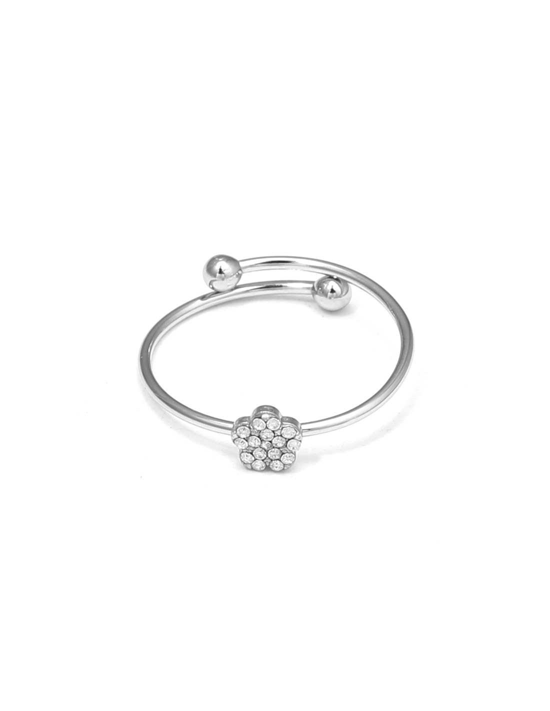 Anillo plateado en forma de media flor adornado con brillantes circonitas. Su diseño minimalista y cómodo la convierte en una pieza versátil.