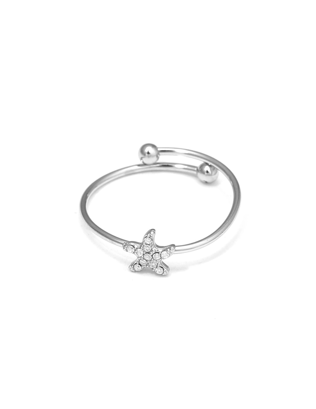 Anillo plateado en forma de media estrella de mar adornado con brillantes circonitas. Su diseño minimalista y cómodo la convierte en una pieza versátil.
