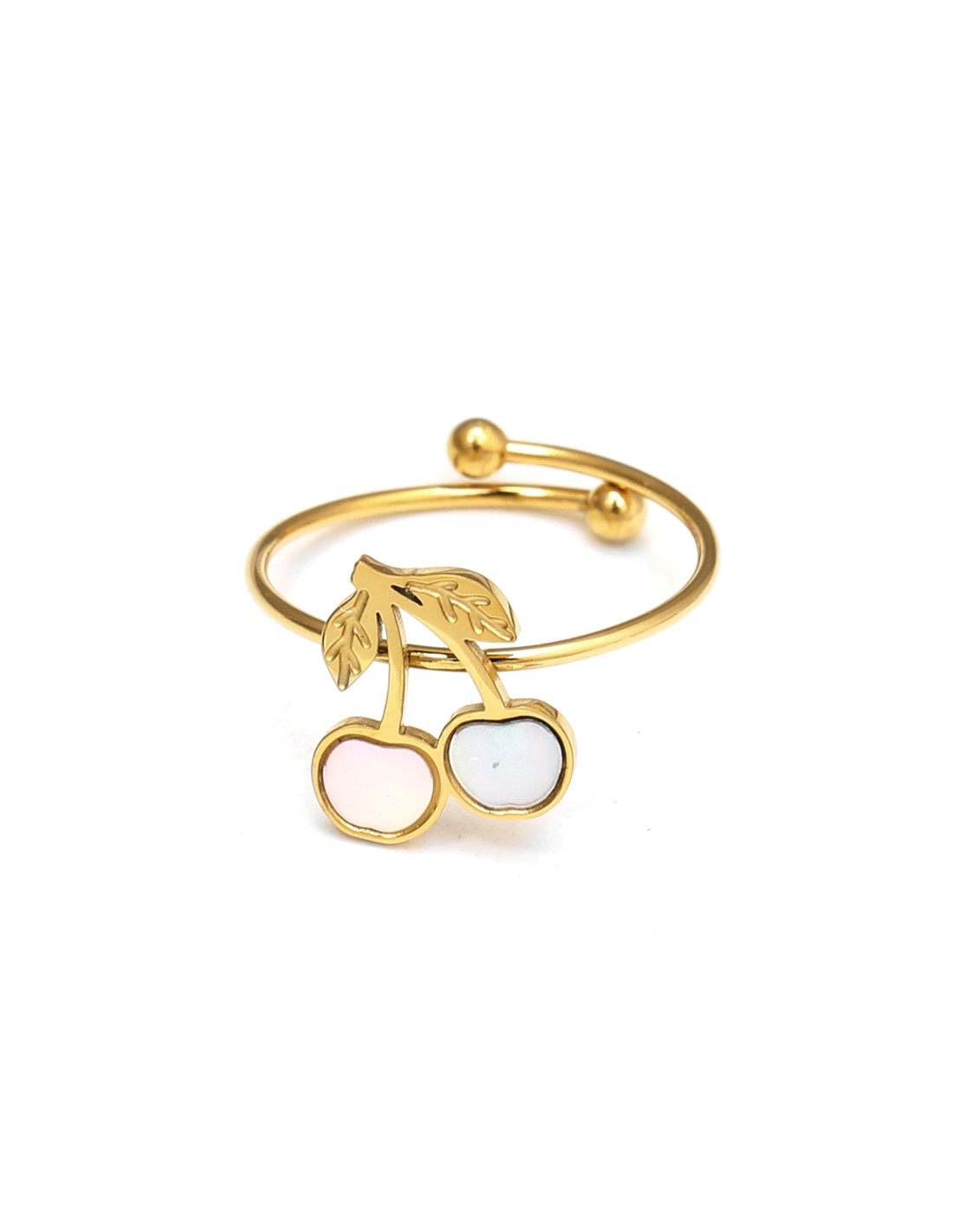 Anillo con un encantador diseño de cerezas de nácar, adornadas con hojas delicadas. Perfecto para agregar un toque fresco y divertido a cualquier look.