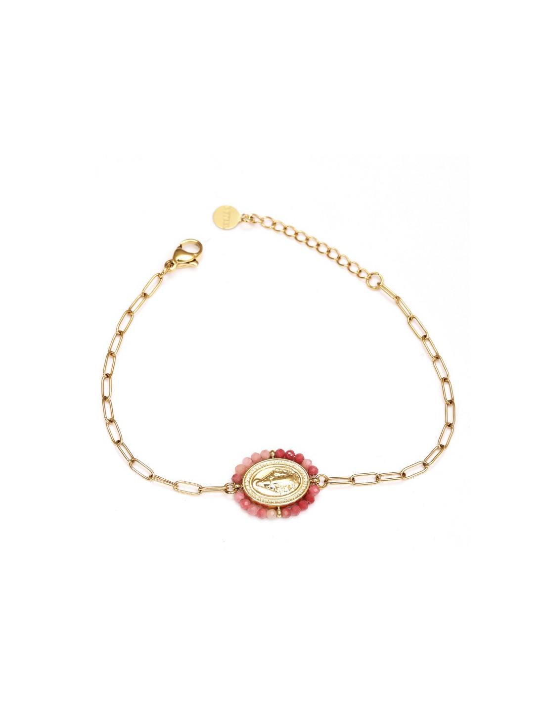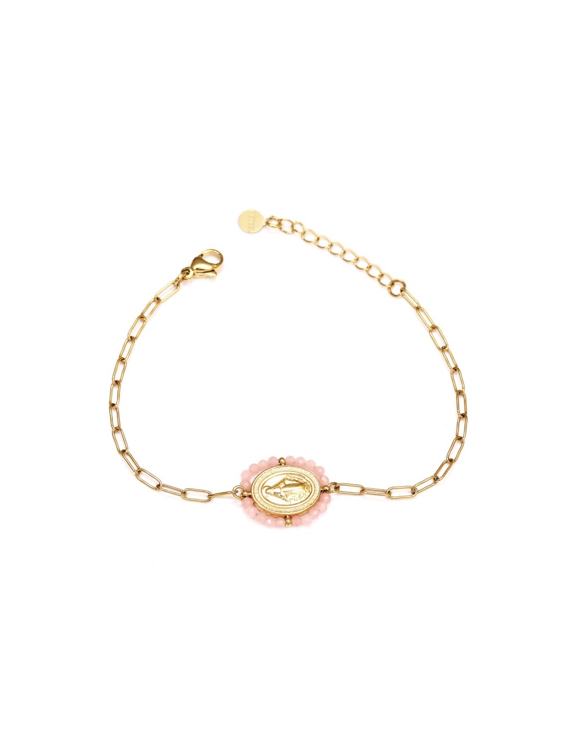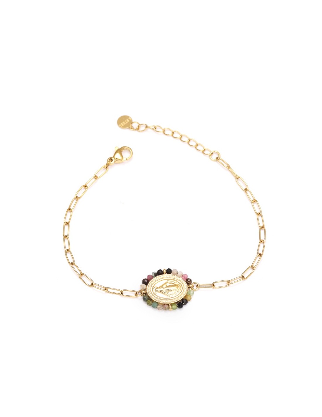 Pulsera dorada delicada con medalla de la Virgen y piedras naturales, ajustable y elegante.