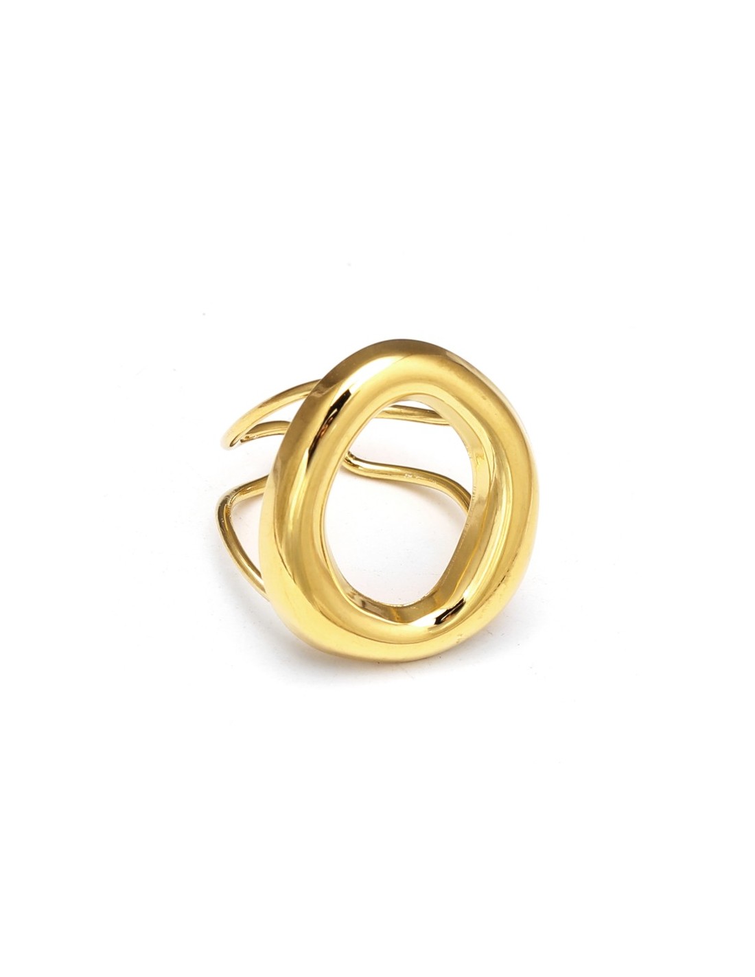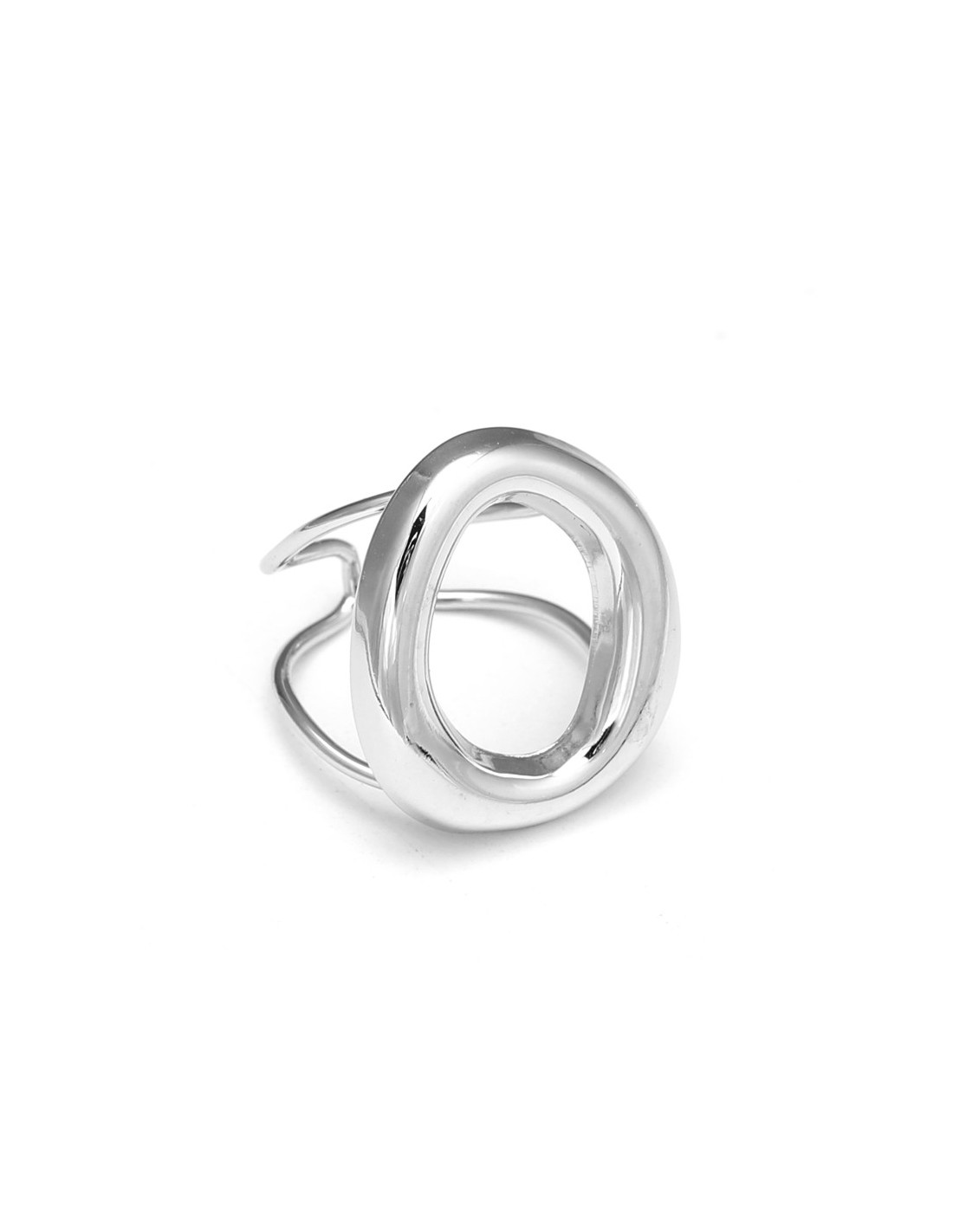 Anillo con una banda fina que sostiene un gran óvalo hueco. Diseño de estilo minimalista y vanguardista. Es un accesorio ligero, elegante y fácil de combinar, ideal para el uso diario.