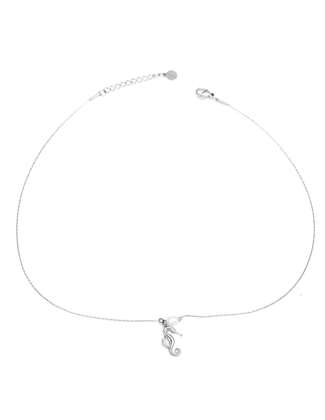 Collar fino con colgante de caballito de mar y una perla, sencillo y elegante.