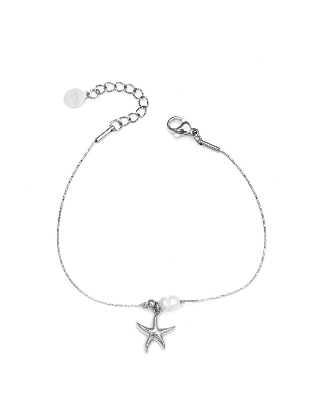Pulsera fina con colgante de estrella de mar y perla, de estilo delicado y elegante.