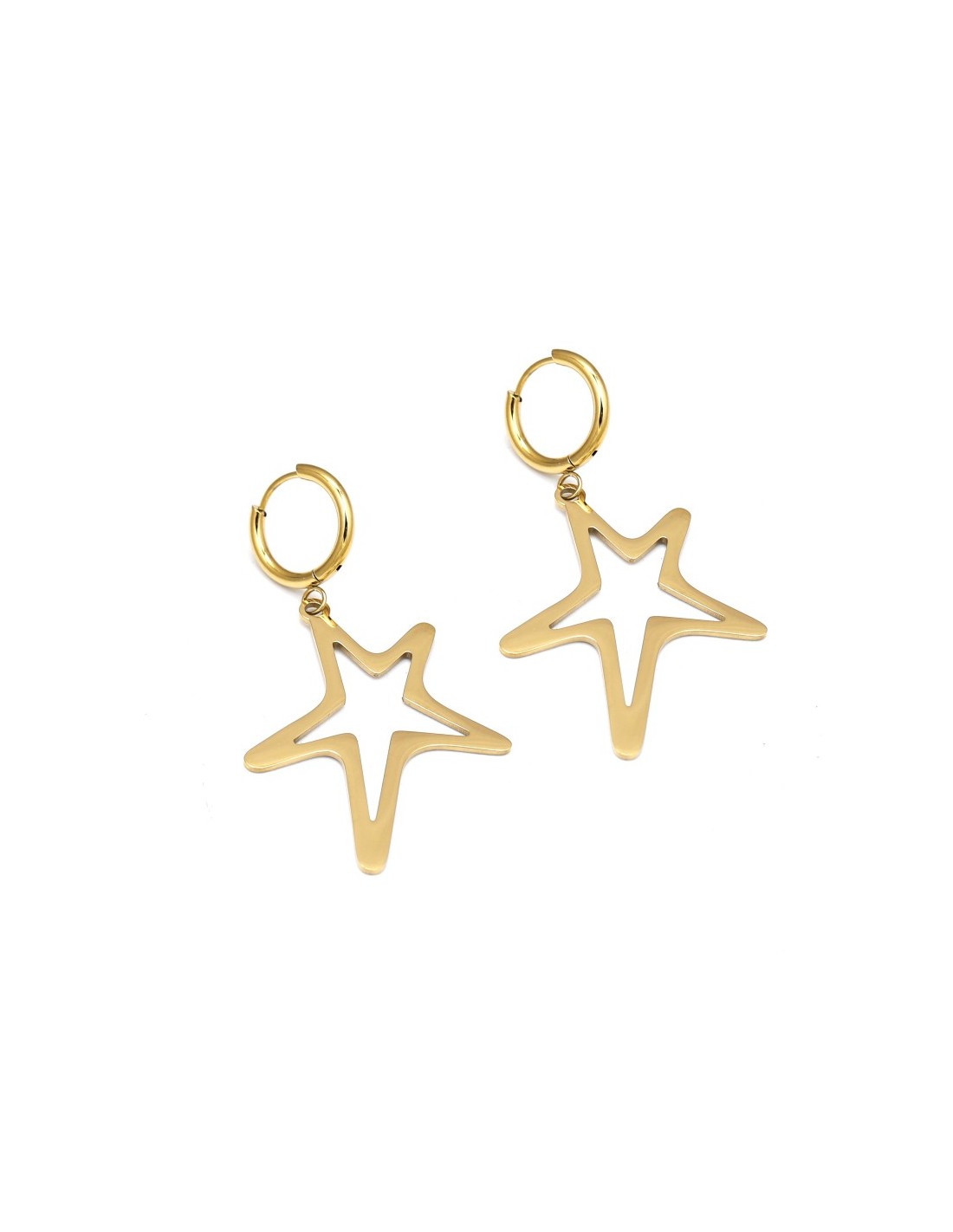 Estos pendientes presentan colgantes en forma de estrella. Su aro combina simplicidad y estilo, perfectos para quienes buscan un accesorio llamativo pero elegante.