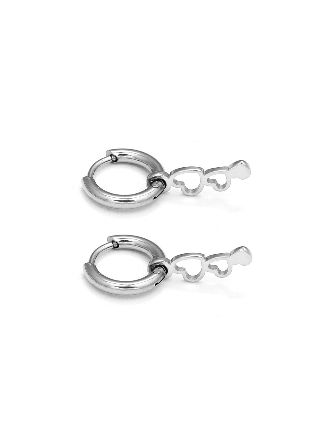 Pendientes de aro plateados pequeños con corazones colgantes, estilo delicado y actual.