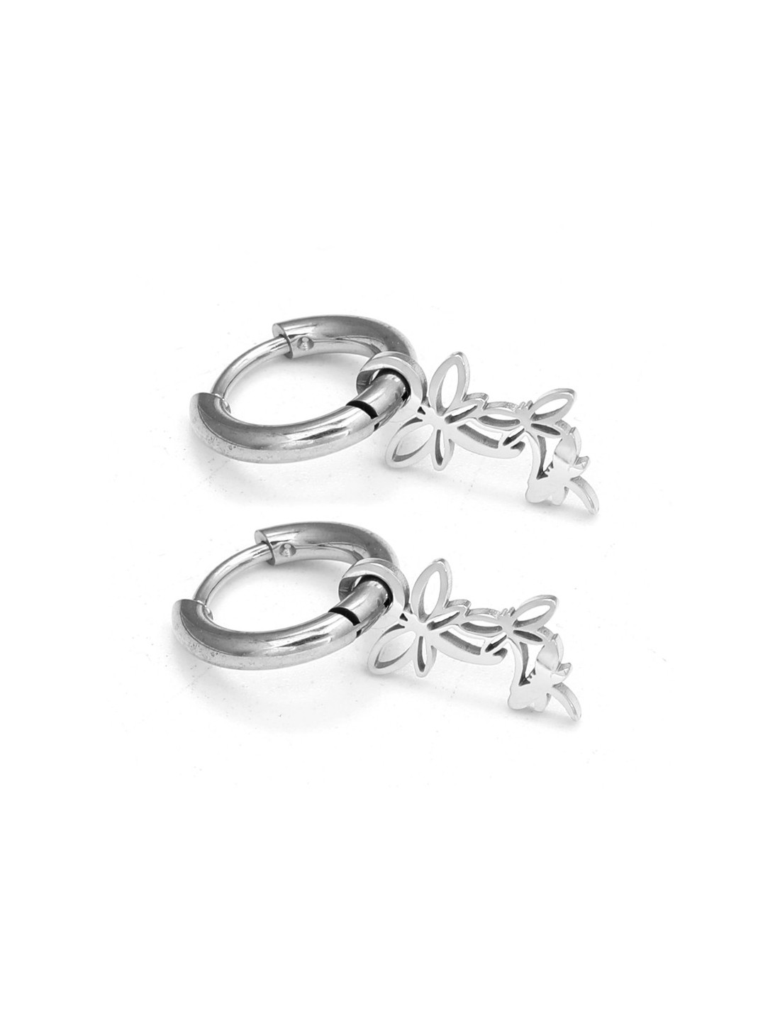 Pendientes de aro plateados pequeños con libélulas colgantes, estilo delicado y actual.