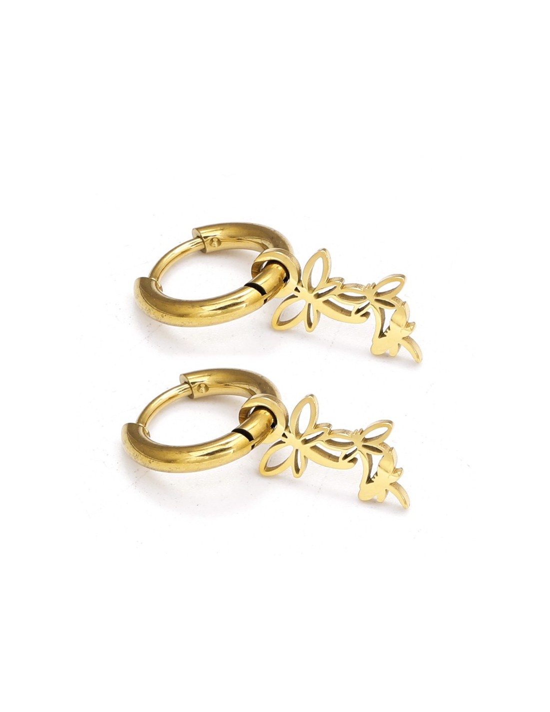 Pendientes de aro dorados pequeños con libélulas colgantes, estilo delicado y actual.