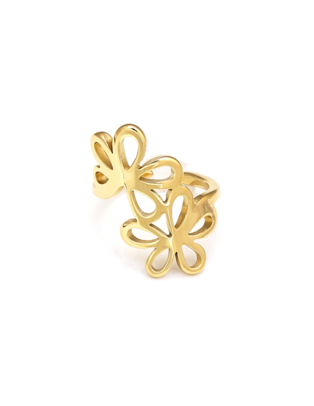 Anillo dorado con flores caladas y líneas finas, ligero y femenino.