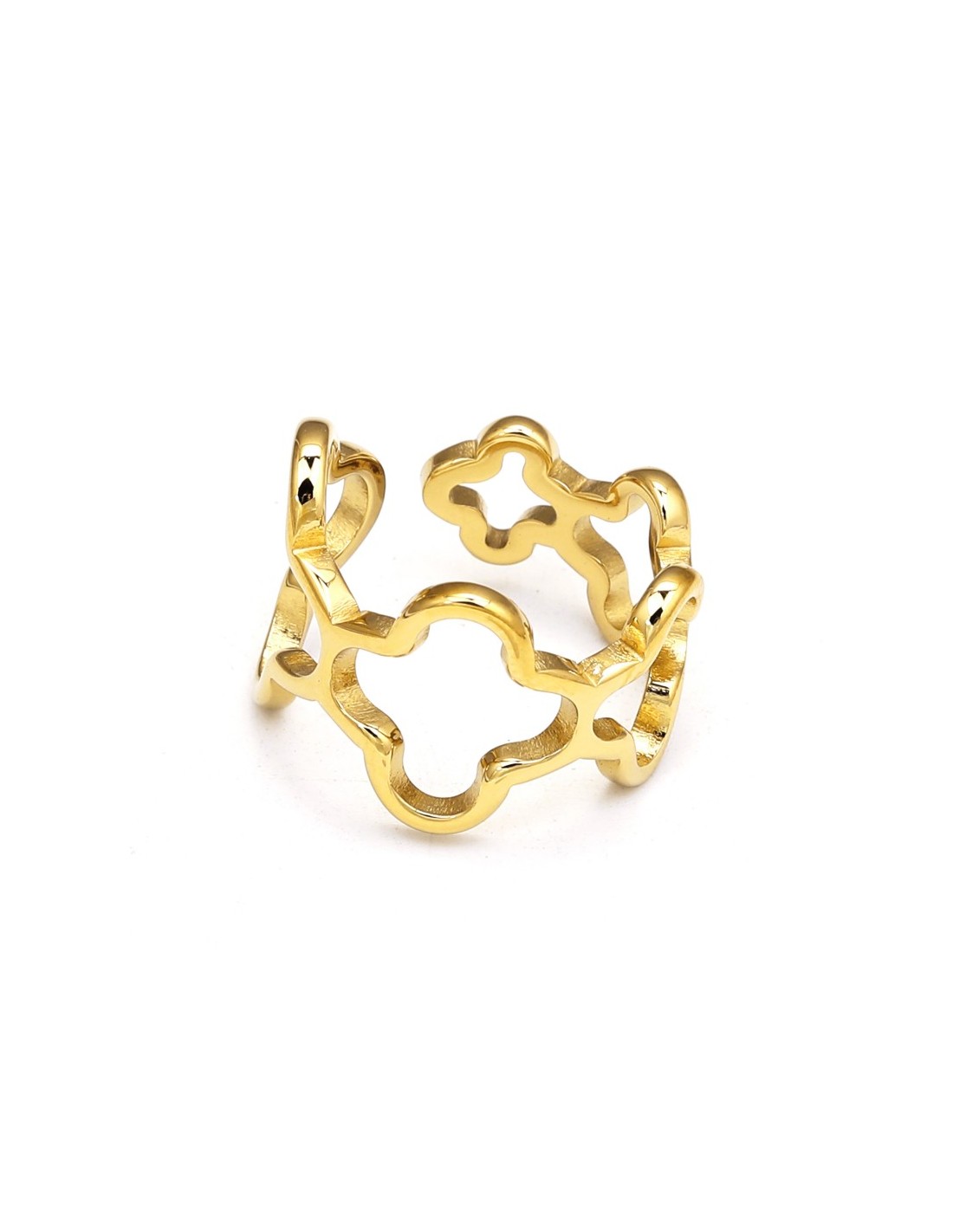 Anillo con diseño de trébol de cuatro hojas calado, símbolo de suerte y estilo delicado.