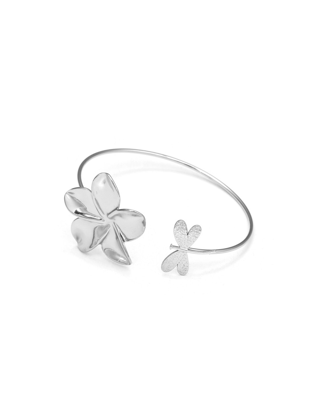 Pulsera rígida plateada con flor y libélula. Su diseño elegante convierte en una joya perfecta para eventos especiales o para añadir un toque romántico y sofisticado a tu look diario.