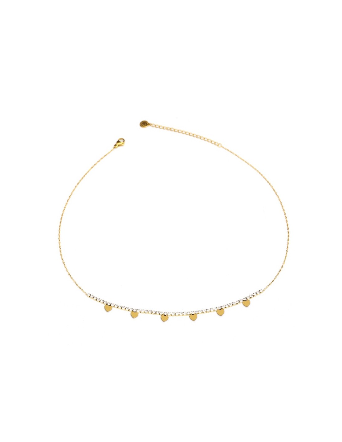 Collar dorado con una fila de piedras brillantes y colgantes de corazón, ideal para un look delicada y elegante.