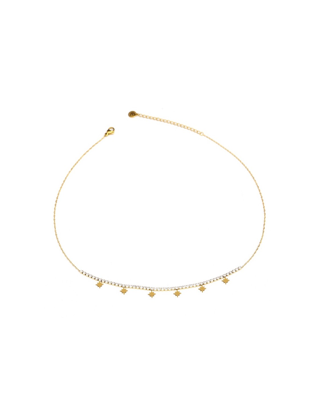 Collar dorado con una fila de piedras brillantes y colgantes de estrella, ideal para un look delicada y moderno.