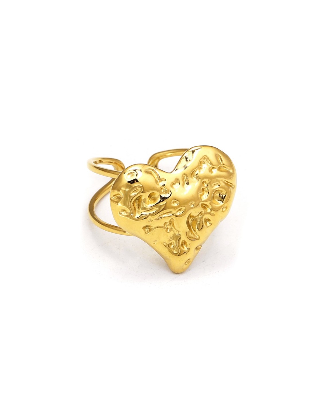 Anillo con corazón central de textura martillada, bordes suaves y apariencia artesanal.