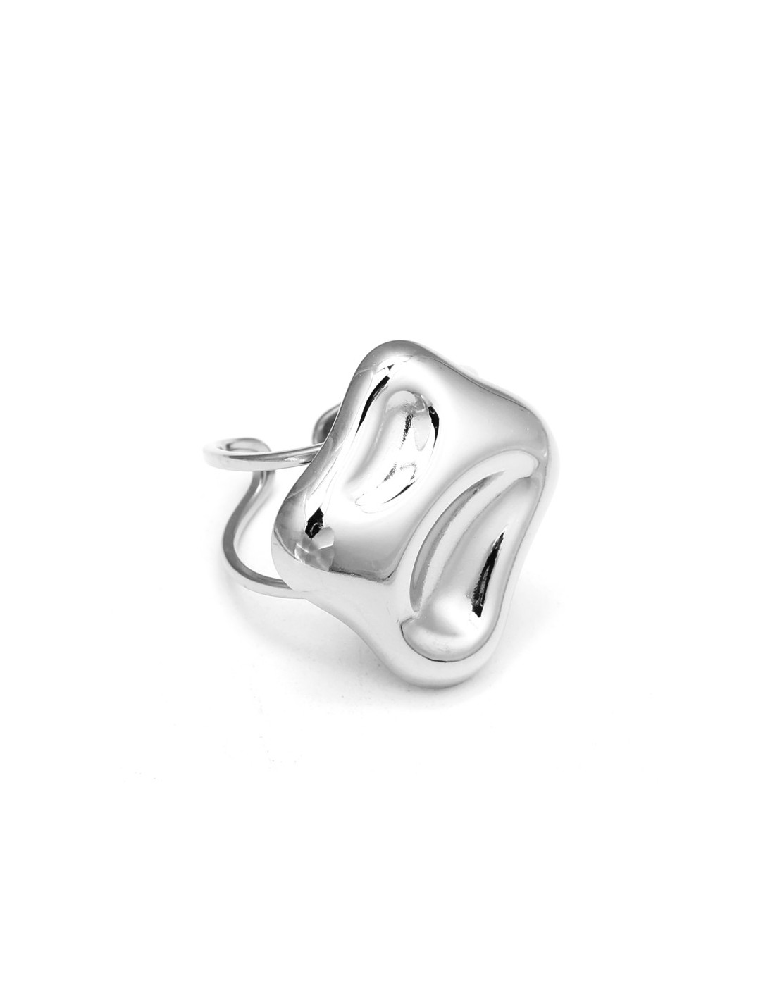 Anillo con diseño irregular y superficie lisa, inspirado en formas naturales y fluidas, con acabado brillante y estilo artístico.