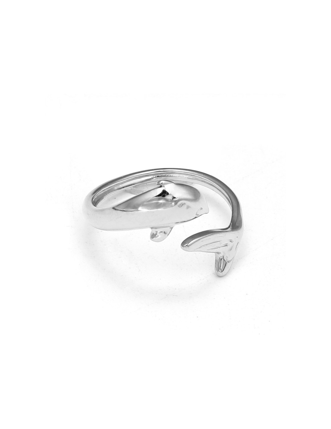 Anillo con silueta de delfín curvada y fluida, representando el movimiento del animal. Superficie lisa y brillante con estilo marino y juvenil.