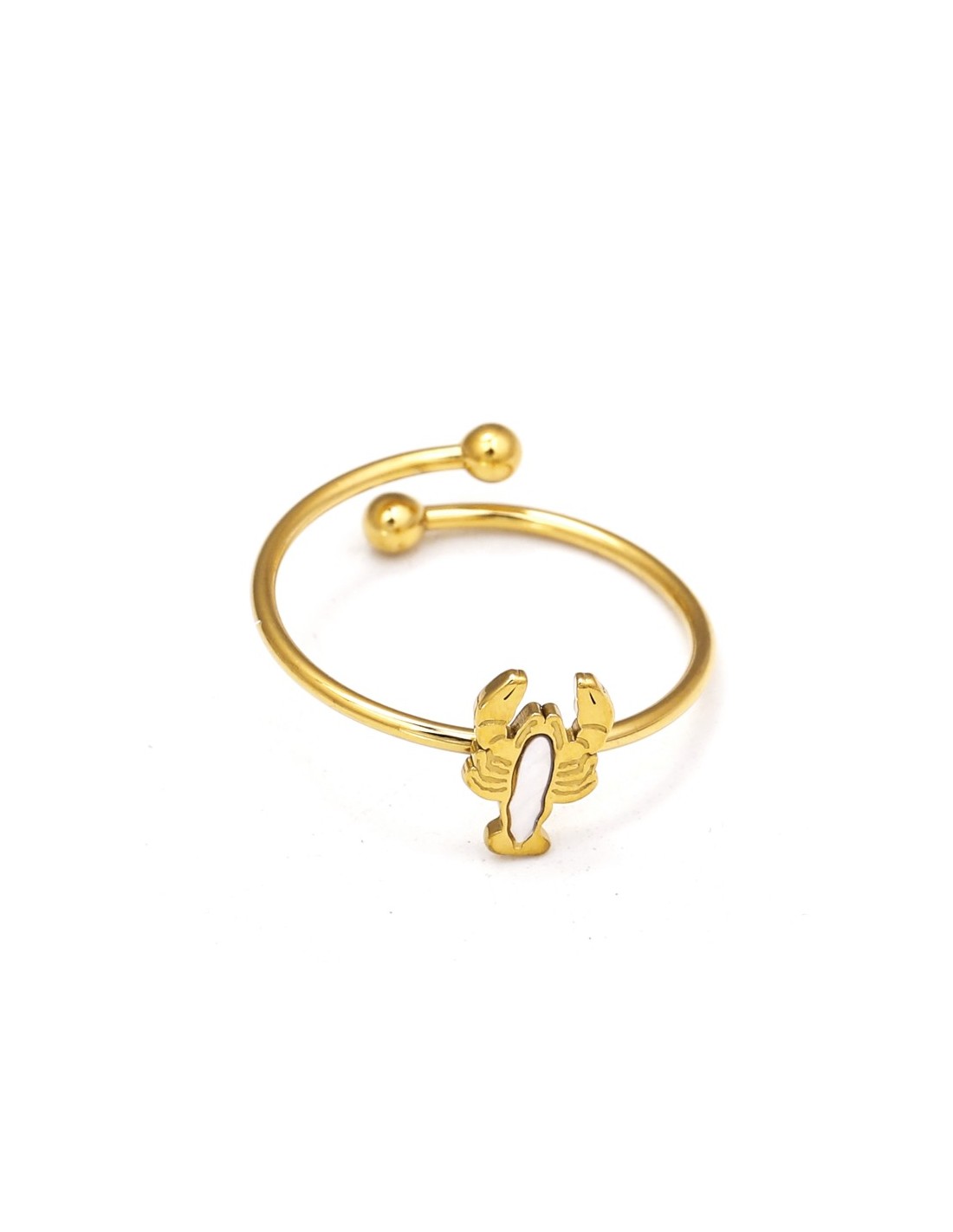 Anillo con diseño de langosta presenta una incrustación central de nácar. Contornos suaves y acabado brillante que combinan el brillo natural del nácar con un estilo marino elegante.