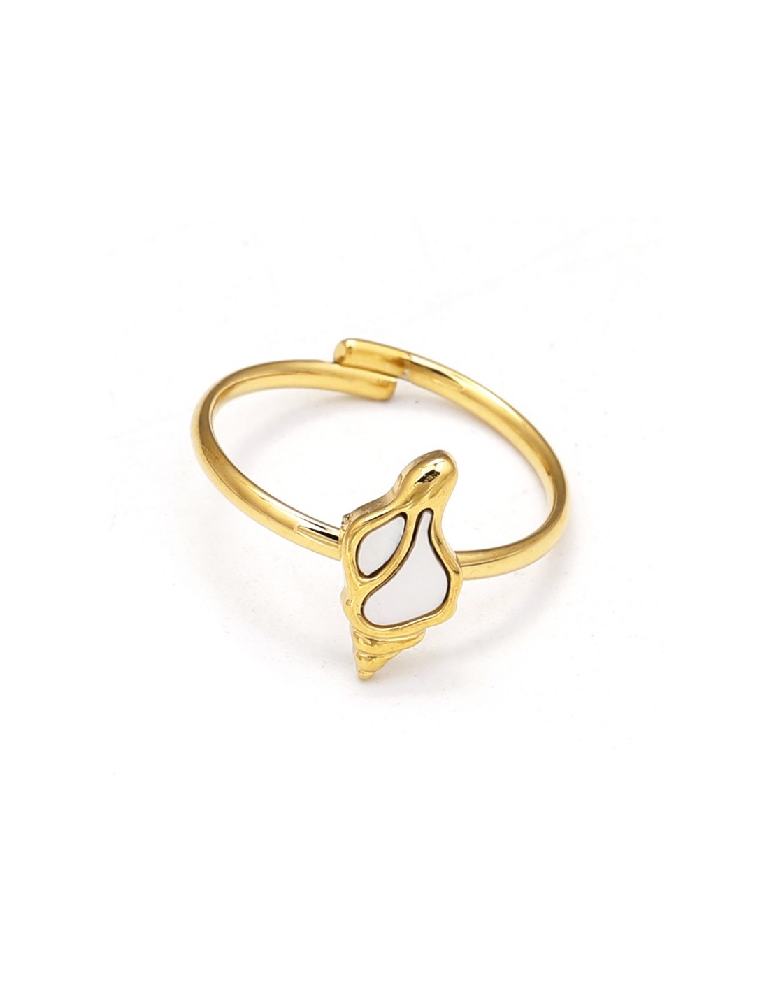 Anillo con forma de caracola en diseño sencillo, con centro de nácar que resalta por su brillo suave. Estilo limpio y moderno con acabado pulido.